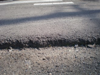 このようにアスファルトの路面と砂利敷の駐車場との間に、4センチくらいの段差ができています。