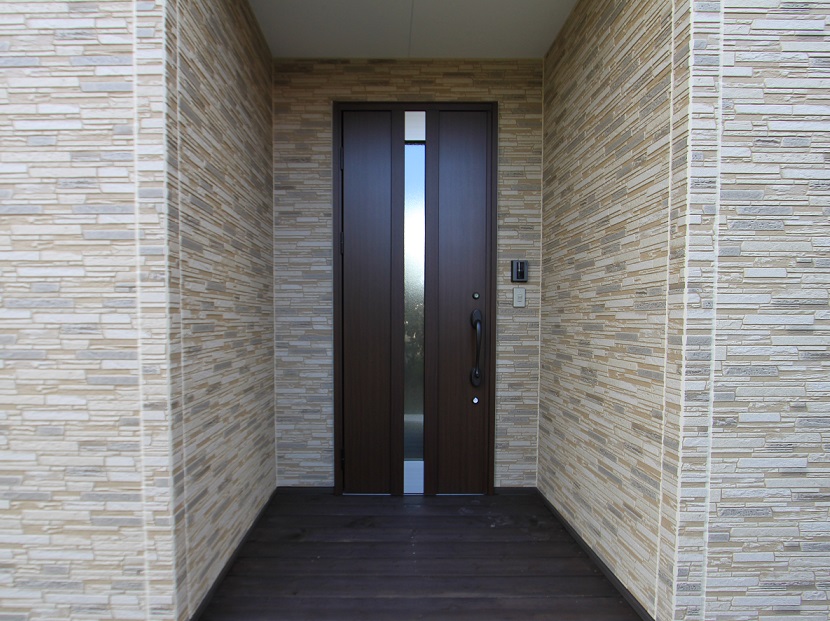 外壁、玄関ドアともにブラウン系でまとめて、高級感があります。 中に入ってみると、広々とした玄関ホールが広がります。 壁・床ともにホワイトにしているので、より広く感じられますね