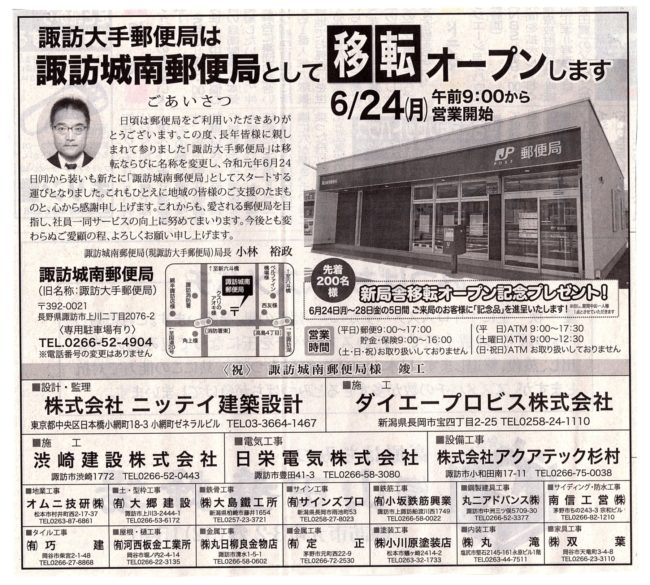 6/17日の長野日報に当社で施工させていただいた「諏訪城南郵便局」様の広告が掲載されました!