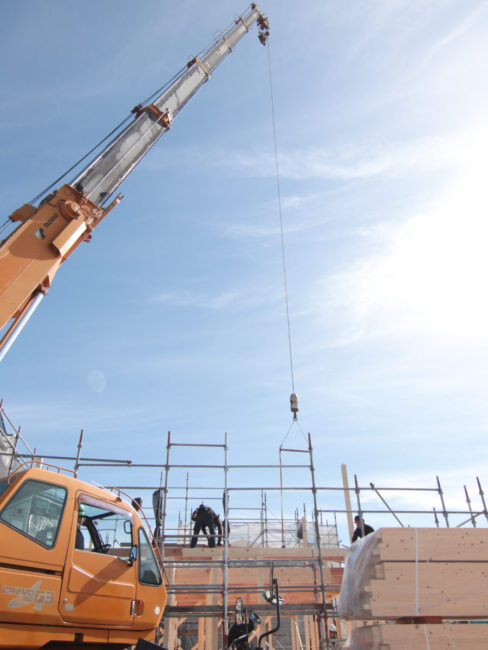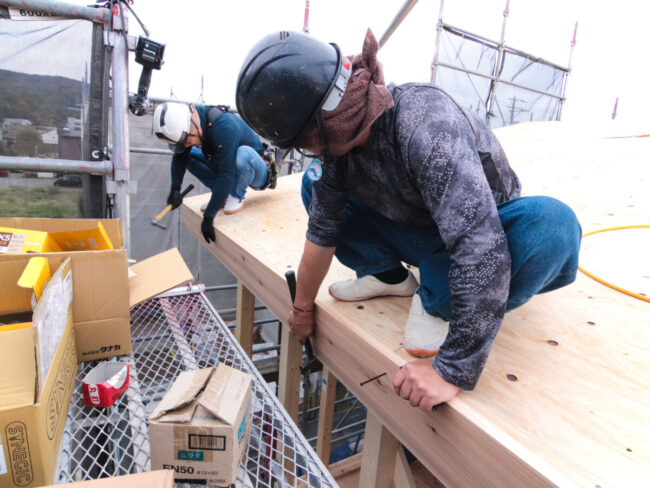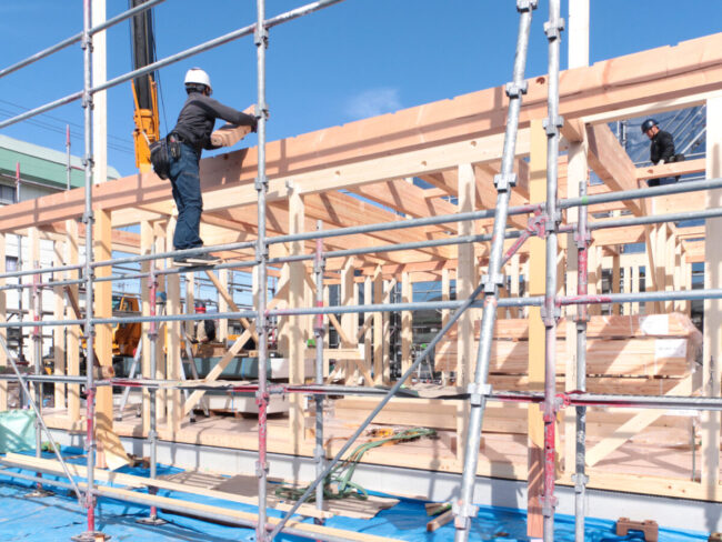 幅が狭く隙間だらけのヒヤッとするような足場を、普通に歩く速度で移動していく大工さんたち。