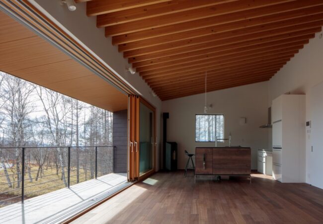 化粧梁が美しい勾配天井と大きな開口によって広々としたLDK